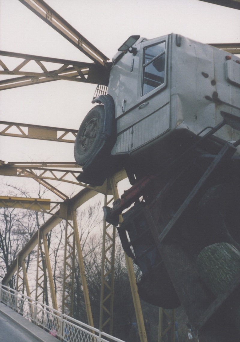 Magasságkorlátozás! |  Összarántott főtartók |  Roncsolt keresztkötések és szélrácsok |  Roncsolt főtartó és pályafüggesztők | | |  Felrántott kocsifülke |  Leugrott fixsaru |  Leszakadt mozgósaru |  Pályaszakadás a hídfőnél | | |  Oldalnézet |  Az okozó KCR daru |  A keresztkötésen fennakadva | | | |